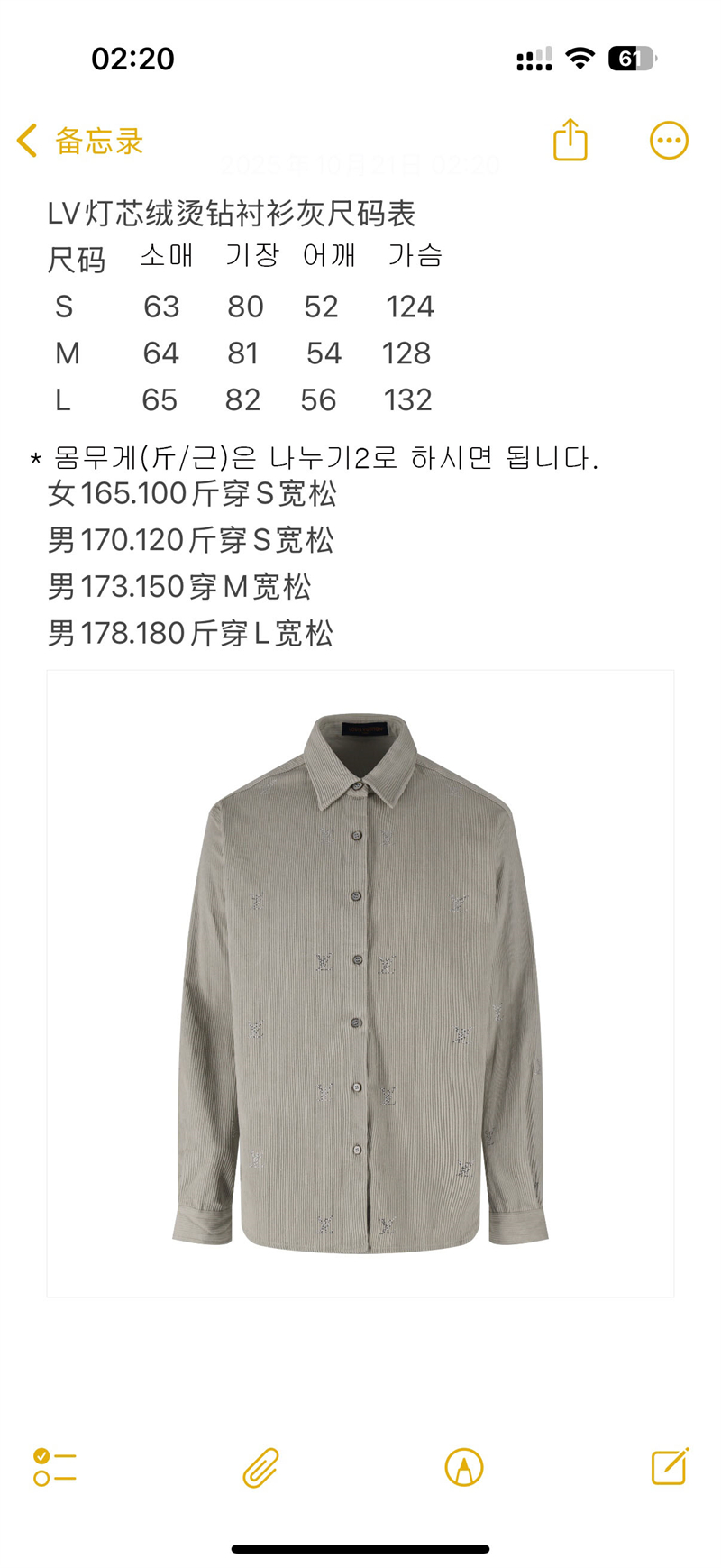 【잔디집2】루이비통 LV 블라종 엠벨리시드 롱 슬리브드 코듀로이 셔츠(세븐)